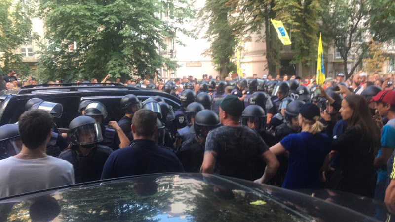 Активно действовала полиция, хотя протестующие заблокировали машину, но всех, кроме водителя, вывели через созданный полицией коридор.