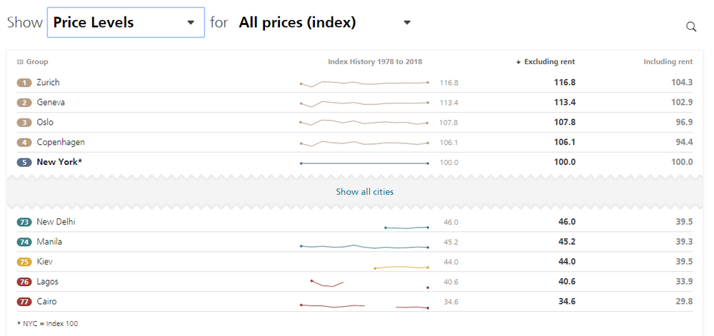 Третьим среди самых дорогих городов является Осло, в пятерку самых дорогих городов также входят Копенгаген и Нью-Йорк.