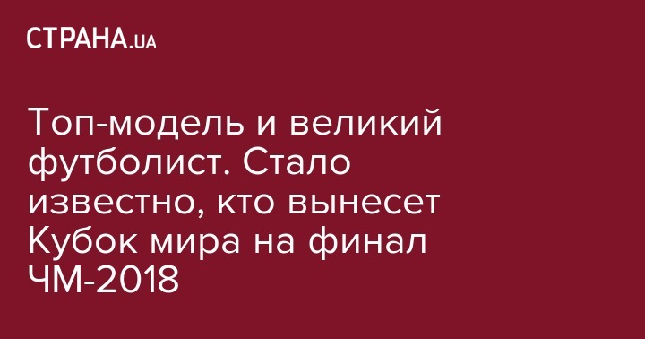 А тем временем в ФИФА определились, кто вынесет Кубок мира на финальный матч. Компанию экс-защитнику Бундестима Филиппу Ламу, составит российская топ-модель Наталья Водянова, сообщает пресс-служба ФИФА.