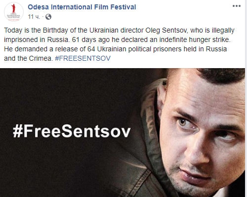 День открытия ОМКФ-2018 совпал с днем рождения украинского режиссера Олега Сенцова, заключенного в России. 13 июля ему исполняется 42 года. Кинофестиваль создал специальный проект #FreeSentsov, чтобы распространить информации о судьбе украинского режиссера, который 61 день назад объявил голодовку.