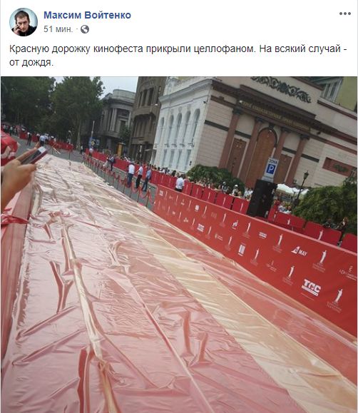 В сети уже появились фотографии красной дорожки фестиваля. Поскольку в Одессе прогнозируется дождь, то в ожидании гостей дорожку на всякий случай прикрыли полиэтиленом.