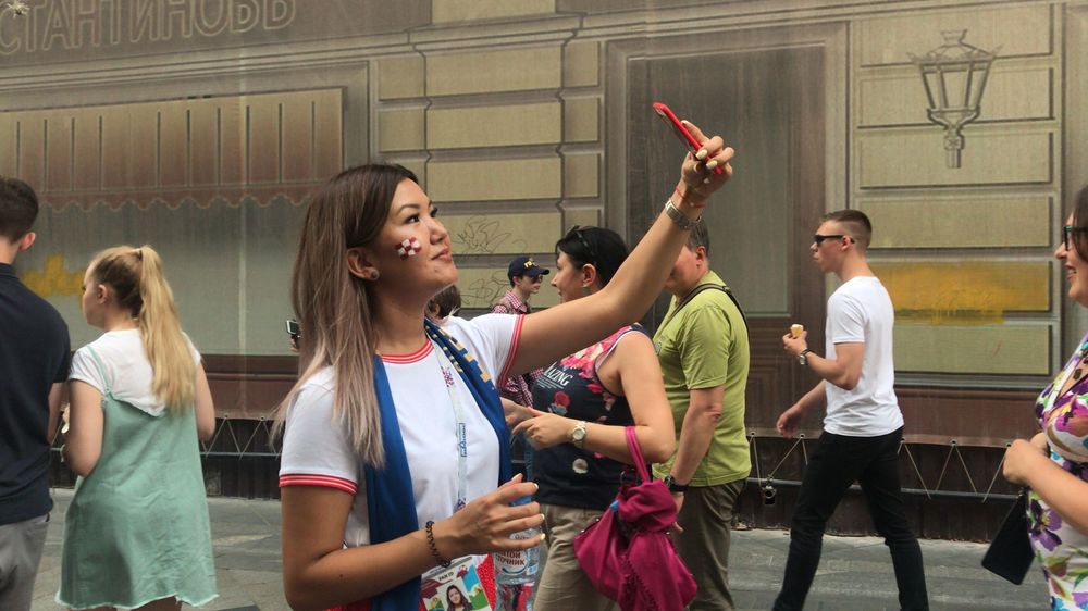 16:22  Фанатка Хорватии делает селфи на улице Никольской в Москве, где расположена главная фан-зона ЧМ-2018.