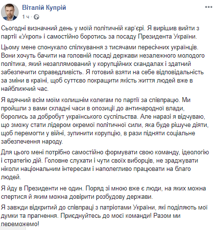 Сегодня, 16 июля, народный депутат Украины Виталий Куприй сделал заявление о выходе из политической партии "УКРОП" и решении принять участие в президентских выборах-2019 как самовыдвиженец.