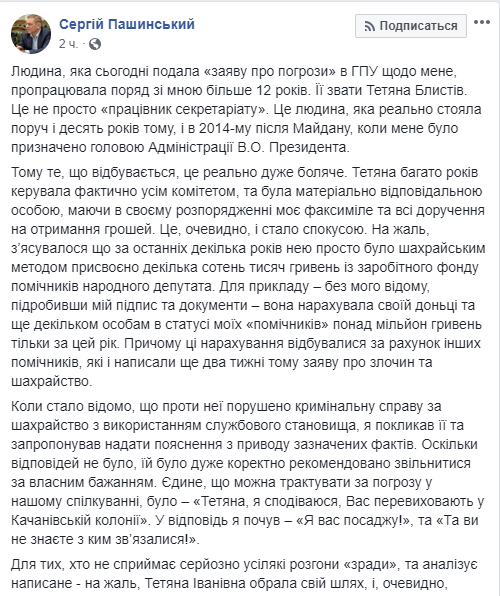 "Человек, который сегодня подал "заявление об угрозах" в ГПУ в отношении меня, проработала рядом со мной более 12 лет. Ее зовут Татьяна Блистив. Это не просто "работник секретариата". Это человек, который реально стоял рядом и десять лет назад, и в 2014-м после Майдана, когда я был назначен главой Администрации  Президента," - написал он в Facebook.