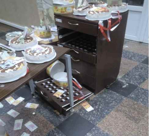 Группа неизвестных проникла в холл здания НАБУ, разбросала торты Roshen и сломала мебель.