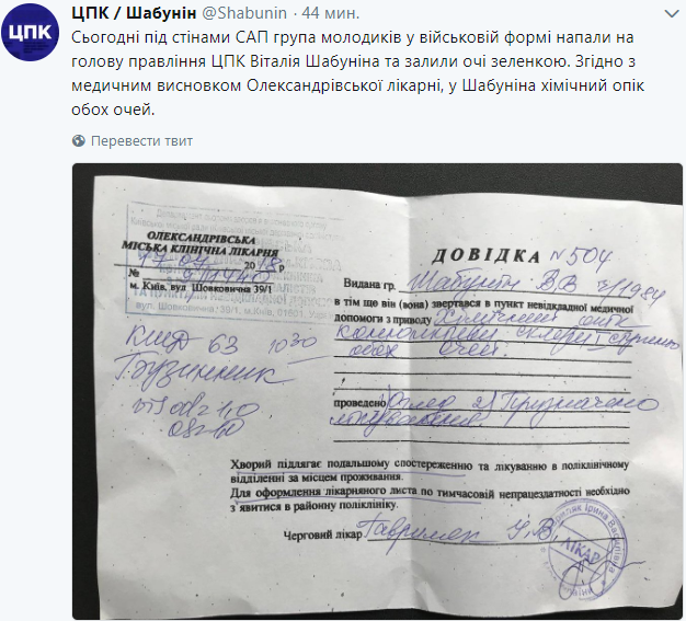 "Сегодня под стенами САП группа молодых людей в военной форме напала на председателя правления ЦПК Виталия Шабунина и залила глаза зеленкой. Согласно медицинскому заключению Александровской больницы, у Шабунина химический ожог обоих глаз", - говорится в сообщении ЦПК в Twitter.