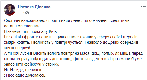 "Сегодня очень благоприятный день для обзывание синоптиков последними словами. Возьмем для примера Киев. И в зоне он фронта лежит, и циклон нас захватил в сферу своих интересов, и тучи ходят, и влажность в воздухе слышится, и вокруг дождевых участков - хоть консервируй. А ты хоть тресни! Висит влажная воздушная масса, дожди прямо, как мышь перед котом, вплотную подходят к столице, фото и видео ливней и гроз должны уже заполнить фейсбучну ленту", - написала  она.