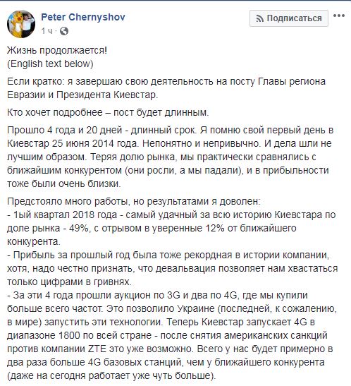 Уже бывший генеральный директор "Киевстар", который сегодня официально ушел в отставку, Петр Чернышов рассказал подробности ухода с должности.