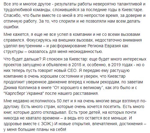 "Что будет дальше? Я спокоен за "Киевстар": еще будет много интересных проектов запущено и объявлено в 2018 году и, особенно, в 2019 - но о них теперь пусть говорит новый СЕО. Я передаю ему растущую компанию в очень хорошем состоянии, и уверен, что "Киевстар" продолжит уверенное движение вперед к новым рекордам, по заветам Джима Коллинза в книге "От хорошего к великому", как это было и с "Карлсберг Украина" после нашего расставания", - подчеркнул Чернышов.