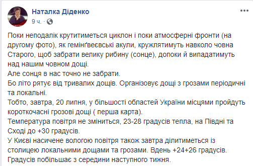 "20 июля, в большинстве областей Украины местами пройдут кратковременные грозовые дожди (первая карта). Температура воздуха не изменится, 23-28 градусов тепла, на юге и востоке до +30 градусов. В Киеве насыщенный влагой воздух также завтра будет делиться со столицей локальными дождями и грозами. Днем 24 + 26 градусов. Градусов увеличится с середины следующей недели",  - написала Диденко