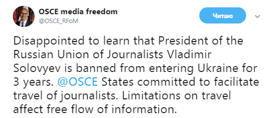 "Разочарован, узнав, что председателю Союза журналистов России Владимиру Соловьеву, запрещен въезд в Украину сроком на три года, - написал Дезир. - Страны ОБСЕ привержены тому, чтобы способствовать поездкам журналистов. Ограничения на поездки влияют на свободное распространение информации".