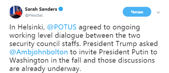 "В Хельсинки президент согласился на продолжающийся диалог на рабочем уровне между сотрудниками советов безопасности двух стран. Президент Трамп попросил (советника по национальной безопасности. — Прим. ред.) Джона Болтона пригласить президента Путина в Вашингтон осенью. Обсуждение этого уже ведется", - написала Сандерс в Twitter.