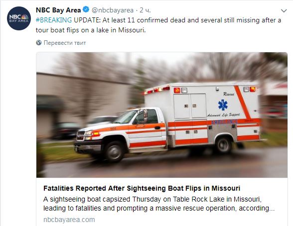 В американском штате Миссури из-за опрокидывания прогулочной лодки на озере Тейбл Рок погибли 11 человек. Об этом в Twitter сообщает телеканал NBC со ссылкой на местные власти.