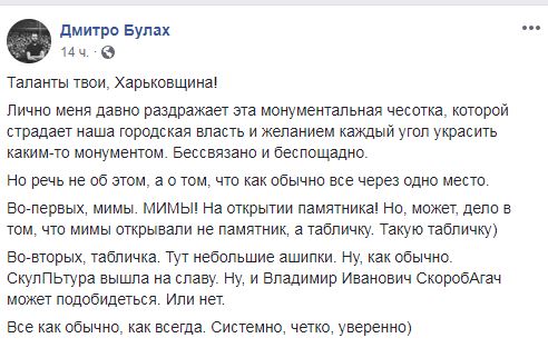 "Тут небольшие ашипки. Ну, как обычно. СкулПЬтура вышла на славу. Ну, и Владимир Иванович СкоробАгач может подобидеться. Или нет. Все как обычно, как всегда. Системно, четко, уверенно", - написал он.