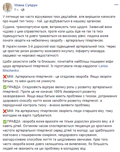 В Facebook она прокомментировала мифы, которые собрала врач-кардиолог Лариса Мищенко.