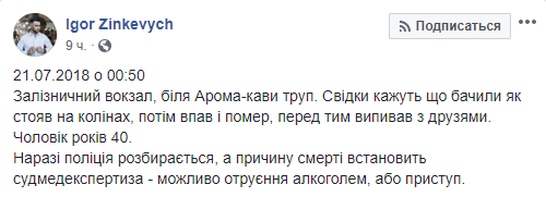 Тело мужчины нашли возле местного кафе около 00:50: "Железнодорожный вокзал, у "Арома кави" труп. Свидетели говорят, что видели как стоял на коленях, потом упал и умер, перед тем выпивал с друзьями", - сказано в сообщении.