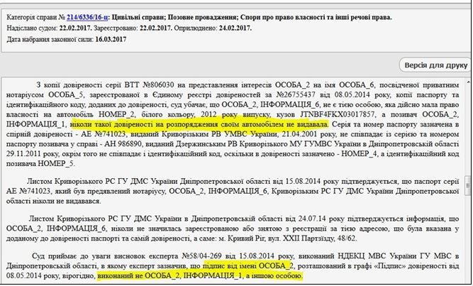 Так, в решении Саксаганского районного суда Кривого Рога Днепропетровской области от 20 февраля 2017 по делу № 214/6336/16-ц указано, что Денега оформил себе в собственность похищенный автомобиль Toyota Camry 2012 года по поддельной доверенности. По данному факту было открыто уголовное производство №12014040750001792.