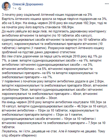 На конец июня 2018 импортные лекарства стоили 100,3 грн за 10 капсул, импортные сосудорасширяющие средства - 46,5 грн за 10 капсул, отечественные антибиотики - 15 грн за 10 таблеток, жаропонижающие и обезболивающие препараты импортные - 13 грн за 1 пакетик, сосудорасширяющие средства отечественные - 10 грн за 10 таблеток и отечественные жаропонижающие и обезболивающие препараты - 7,5 грн за 10 таблеток", - написал на своей странице в Facebook эксперт.