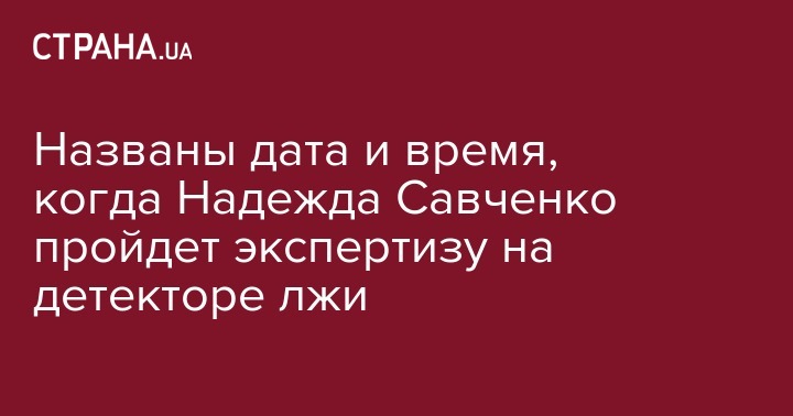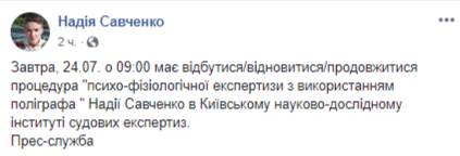"Завтра, 24.07 в 09:00 должен состояться/возобновиться/продолжиться процедура "психо-физиологической экспертизы с использованием полиграфа" Надежды Савченко в Киевском городском институте досудебных экспертиз", - сообщила пресс-служба народного депутата на ее странице в социальной сети Facebook в понедельник вечером.
