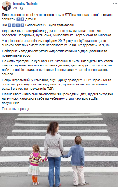 "Лидерами этого антирейтинга два последних года остаются пять областей: Запорожская, Луганская, Николаевская, Херсонская и Киевская. По сравнению с аналогичным периодом 2017 полиции удалось несколько снизить показатель смертности несовершеннолетних на наших дорогах - на 9,9%. В первую очередь, благодаря оперативно-профилактической отработке и превентивной работе", - написал Тракало.