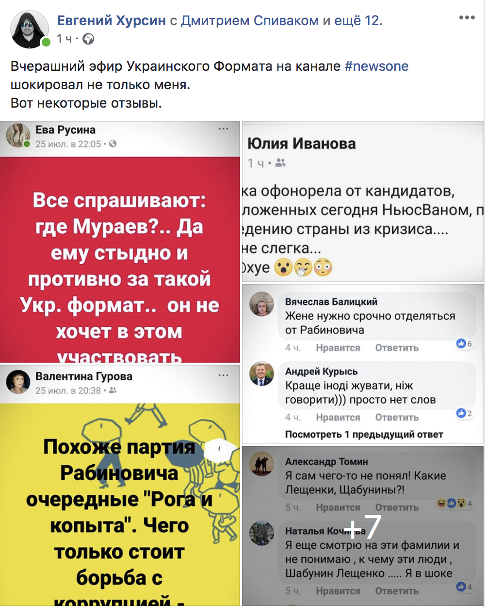 Нардеп Евгений Мураев, который недавно передал корпоративные права на телеканал NewsOne своему отцу, отреагировал на удивление телезрителей по поводу вчерашнего эфира ток-шоу "Украинский формат", в котором лидер партии "За Життя" нардеп Вадим Рабинович представил собственную программу выхода Украины из кризиса "Украинская мечта" и отобрал членов своей команды.