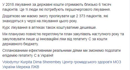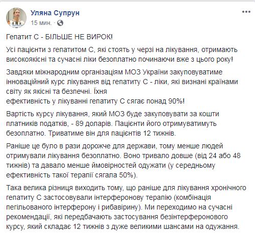 "Благодаря международным организациям, Минздраву Украины удалось закупить инновационный курс лечения от гепатита С - лекарства, которые признаны странами мира как качественные и безопасные. Их эффективность в лечении гепатита С достигает более 90%!", - сообщила она.
