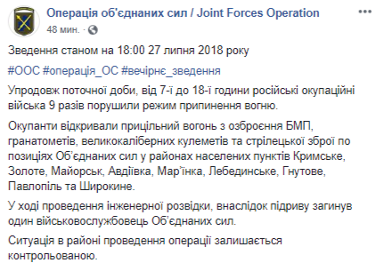 "На протяжении текущих суток с 7 до 18 часов российские оккупационные войска 9 раз нарушили режим прекращения огня. (…) В ходе проведения инженерной разведки в результате подрыва погиб один военнослужащий объединенных сил", - говорится в сводке пресс-центра.
