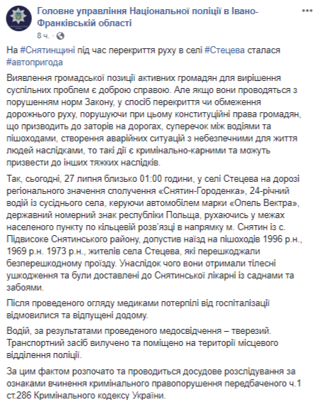 "На дороге регионального значения сообщением Снятин – Городенка, 24-летний водитель из соседнего села, управляя автомобилем марки Opel Vectra, государственный номерной знак республики Польша, двигаясь в пределах населенного пункта по кольцевой развязке в направлении с.Снятин из с.Подвысокое, допустил наезд на пешеходов 1996, 1969, 1973 годи рождения, жителей села Стецева, которые препятствовали проезду. Вследствие чего они получили телесные повреждения и были доставлены в Снятинскую больницу с ссадинами и ушибами", - сказано в сообщении.