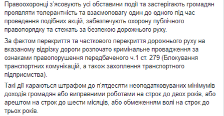 По факту перекрытия и частичного перекрытия дорожного движения на указанном отрезке дороги начато уголовное производство по ч.1 ст. 279 (блокирование транспортных коммуникаций, а также захват транспортного предприятия) Уголовного кодекса Украины.