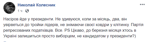 "Насиров идет в президенты. Не удивлюсь, если через месяц, два, он ворвется в тройку лидеров, не снимая своего одеяла в клетку. Партия репрессированных налоговиков. Все. PS Интересно, до марта месяца кто-то в Украине останется просто избирателем, а не кандидатом в президенты?", - удивляется депутат из Кривого Рога Николай Колесник.