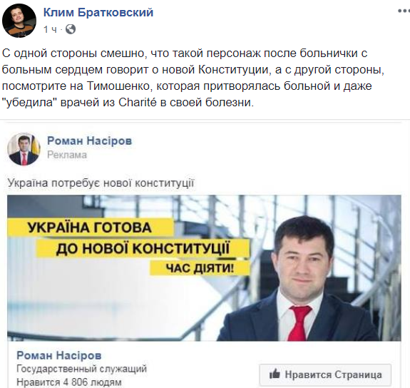 "С одной стороны смешно, что такой персонаж после больнички с больным сердцем говорит о новой Конституции, а с другой стороны, посмотрите на Тимошенко, которая притворялась больной и даже "убедила" врачей из Charité в своей болезни", - пишет блогер Клим Братковский.