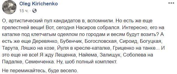 "Интересно, его на каталке под клетчатым одеялом по городам и весям будут возить? А есть же еще Деревянко, Бубенчик, Богословская, Сироид, Богуцкая, Тарута, Ляшко на козе, Йуля в кресле-каталке, Гриценко на танке... И это еще не все! Я жду Лещенка, Найема, Залищук, Соболева на Падалке, Семенченка. Ну, шоб полный комплект", - перечисляет варианты блогер Олег Кириченко.