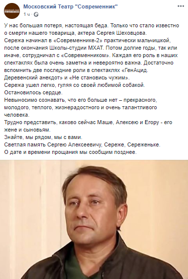 "У нас большая потеря, настоящая беда. Только что стало известно о смерти нашего товарища, актера Сергея Шеховцова", - говорится в сообщении.