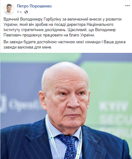 "Благодарен Владимиру Горбулину за огромный вклад в развитие Украины, который он сделал в должности директора Национального института стратегических исследований. Счастлив, что Владимир Петрович продолжает работать на благо Украины", - написал Порошенко.