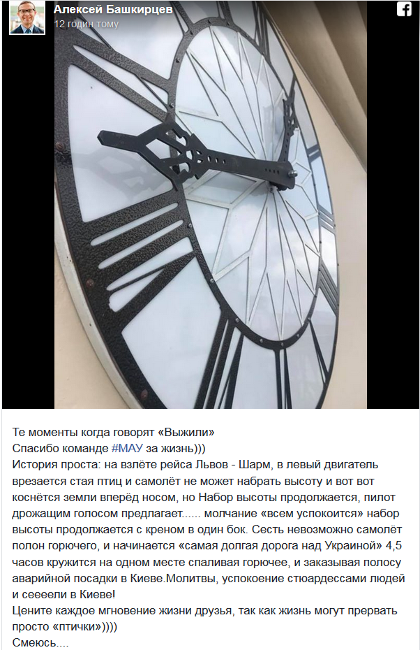 "Те моменты когда говорят "Выжили". Спасибо команде МАУ за жизнь. История проста: на взлете рейса Львов - Шарм, в левый двигатель врезается стая птиц и самолет не может набрать высоту и вот-вот коснется земли вперед носом, но набор высоты продолжается, пилот дрожащим голосом предлагает...  "всем успокоится", набор высоты продолжается с креном в один бок. Сесть невозможно - самолет полон горючего, и начинается "самая долгая дорога над Украиной". 4,5 часов кружится на одном месте спаливая горючее, и заказывая полосу аварийной посадки в Киеве. Молитвы, успокоение стюардессами людей и сеееели в Киеве! Цените каждое мгновение жизни друзья, так как жизнь могут прервать просто "птички")))) Смеюсь...", - написал Алексей Башкирцев.