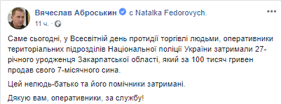 "Во Всемирный день противодействия торговле людьми оперативники территориальных подразделений Национальной полиции Украины задержали 27-летнего уроженца Закарпатской области, который за 100 тысяч гривен продал своего 7-месячного сына", - написал в соцсети Аброськин.