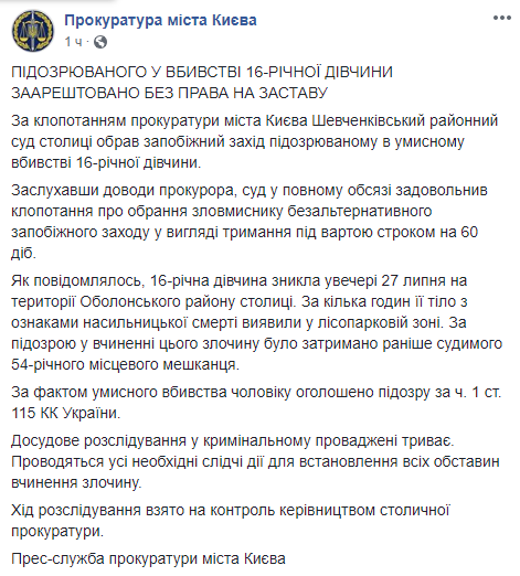 Как сообщалось, 16-летняя девушка, жительница Закарпатской области, исчезла вечером 27 июля на территории Оболонского района Киева. Около 3-х часов ночи 28 июля ее тело с признаками насильственной смерти было найдено в лесопарковой зоне.