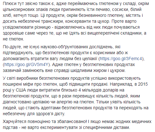 Супрун также сообщила, что нет ни одного исследования, которое подтверждает пользу безглютеновых продуктов. По ее словам, производители безглютеновых продуктов используют мифы о глютене, чтобы повысить продажи.