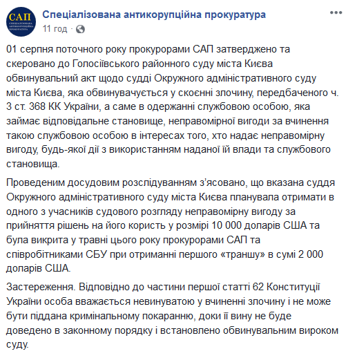"1 августа текущего года прокурорами САП утвержден и направлен в Голосеевский районный суд города Киева обвинительный акт в отношении судьи Окружного административного суда города Киева, обвиняемой в совершении преступления, предусмотренного ч. 3 ст. 368 УК Украины, а именно в получении должностным лицом, занимающим ответственное положение, неправомерной выгоды за совершение таким должностным лицом в интересах того, кто предоставляет неправомерную выгоду, любого действия с использованием предоставленной ему власти и служебного положения", - уточнили в пресс-службе САП.