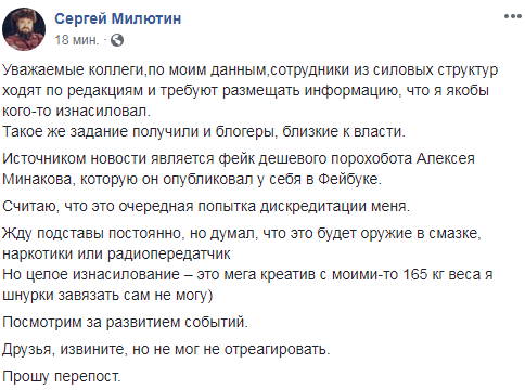 "Уважаемые коллеги, по моим данным, сотрудники из силовых структур ходят по редакциям и требуют размещать информацию, что я якобы кого-то изнасиловал, - написал у себя на ФБ Милютин. - Такое же задание получили и блогеры, близкие к власти. Источником новости является фейк дешевого порохобота Алексея Минакова, которую он опубликовал у себя в Фейбуке. Считаю, что это очередная попытка дискредитации меня. Жду подставы постоянно, но думал, что это будет оружие в смазке, наркотики или радиопередатчик Но целое изнасилование – это мега креатив с моими-то 165 кг веса я шнурки завязать сам не могу".