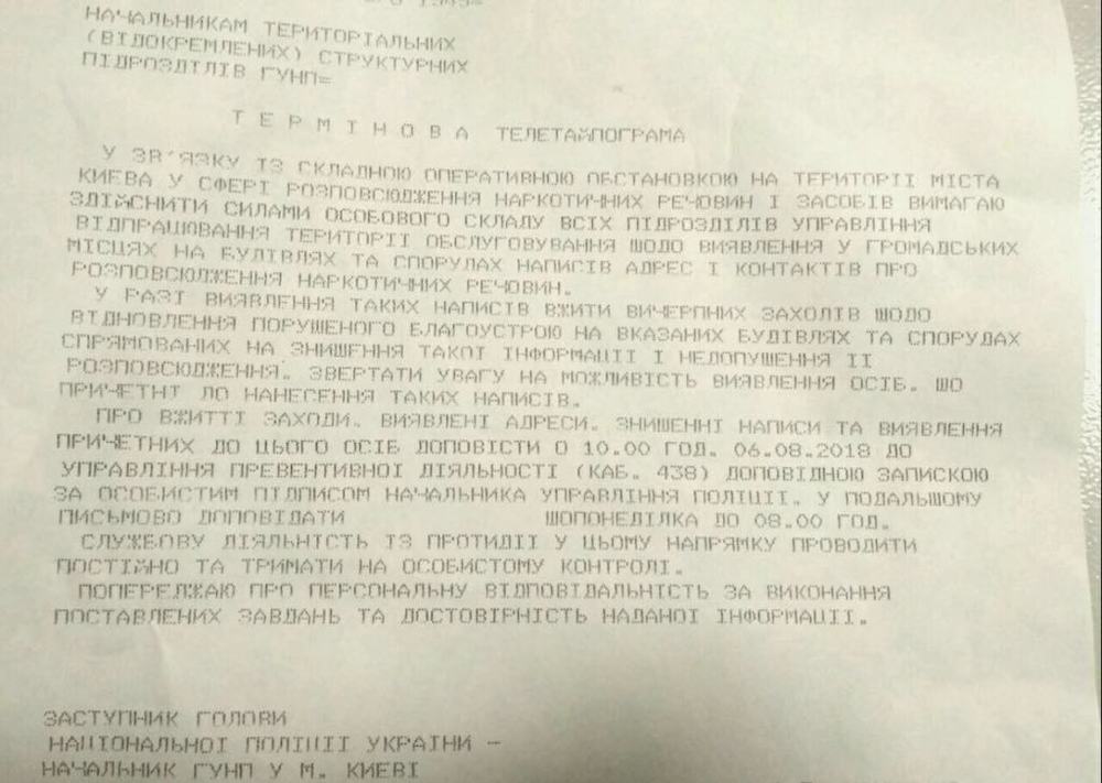 И в тот же день, сразу после совещания с прокурорами, главный полицейский Киева Андрей Крищенко дал команду разослать телетайпом (это безнадежно устаревшее средство передачи информации все еще активно используют в полиции) срочную телеграмму, чтобы во всех районах Киева на территории оперативного обслуживания были проведены рейды по поиску мест распространения наркотиков и особое внимание, чтобы уделили обьявлениям, которые якобы размещают наркоторговцы.