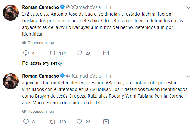 "Двое молодых людей были арестованы в штате Баринас предположительно за то, что они связаны с атакой на проспекте Боливара. Брайан Хесус Оропеса Руис по кличке "Поэт" и Янни Фабиана Перния Коронель, aka "Мария", были задержаны сегодня на шоссе на пути в штат Тачира (западный штат на границе с Колумбией - Прим. Ред.). Они были доставлены в СЕБИН (Боливарианская служба национальной разведки - Прим. Ред.)", - написал журналист.