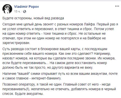 Кстати, его догадки подтвердил мобильный оператор. "Позвонил оператору, я такой не один. Главный совет от него - не перезванивать(!), желательно не отвечать, добавлять номера в черный список. Будьте аккуратны", - написал Попов.
