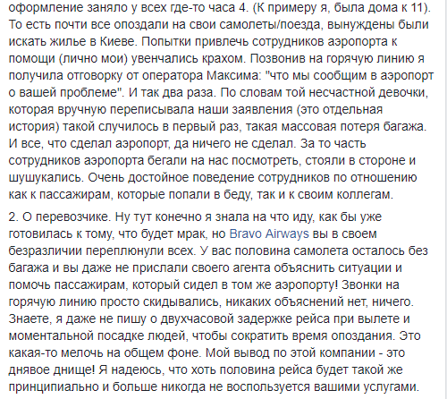 "А теперь представьте, даже 50% рейса пакетного тура - это как минимум половина людей в возрасте, семьи с детьми и тп. Которые стоят в зале выдачи багажа, где нет ни где попить/купить воды/еды, присесть (только на лентах выдачи багажа). Все с самолета, как минимум 4 часа на ногах. А дальше лучше, большая часть из них не живут в Киеве и у них запланирована или пересадка на другой рейс, или поездка домой на поезде. Вот это все оформление заняло у всех где-то часа 4," - уточнила она.