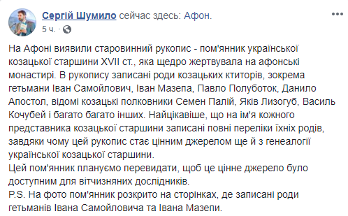 Директор Международного института афонского наследия в Украине Сергей Шумило показал старинную рукопись - помянник украинской казацкой старшины XVII в., которую обнаружили на Афоне. Об этом он написал в Facebook.