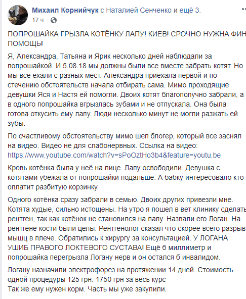 Позже в Facebook пользователи написали, что несколько дней наблюдали за нищей и в этот день собирались вместе забрать котят. По его словам, двух котят удалось забрать, но одного попрошайка начала грызть зубами и не отпускала.