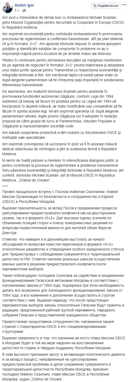 В среду на своей странице в Facebook он сообщил, что встретился с главой миссии ОБСЕ в Молдавии Майклом Скэнланом по случаю завершения его пятилетнего мандата в Кишиневе и выразил признательность за вклад дипломата "в продвижение процесса урегулирования приднестровского конфликта как на двустороннем уровне, так и в формате "5+2" (Молдавия и Приднестровье - стороны, Украина, Россия и ОБСЕ - посредники, ЕС и США - наблюдатели).