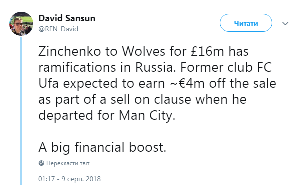 Из этих 16 миллионов Манчестер Сити был бы вынужден передать около 4 миллионов фунтов бывшему клубу украинца, российской "Уфе".