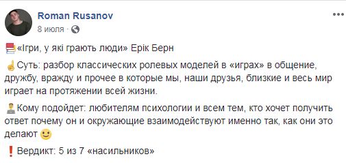 Ну а в остальном, судя по постам, Русанов настоящий "спортсмен, красавец и интеллектуал". Например, слушает рейв и рекомендует книгу психолога Эрика Берна "Игры, в которые играют люди". Также много постов о книгах об историях успеха в бизнесе, менеджменте и т.д.