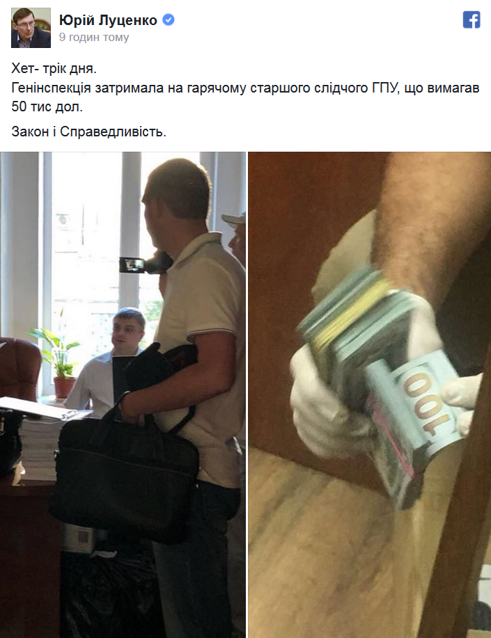 "Хет-трик дня. Генинспекция задержала на горячем старшего следователя ГПУ, который вымогал 50 000 долларов. Закон и справедливость", - написал Юрий Луценко.
